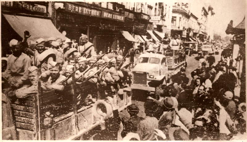 Strada Știrbei Vodă era încă plină de molozul lăsat în urmă de bombardamentul americanilor de la 4 aprilie. Printre trecătorii opriți să vadă defilarea învingătorilor se aflau și doi olteni. Terminaseră de vândut marfa din coșuri și priveau spectacolul sprijinindu-se în cobilițele ce păreau îndoite de greutatea lor. Zice unul dintre ei, vădit uimit:
